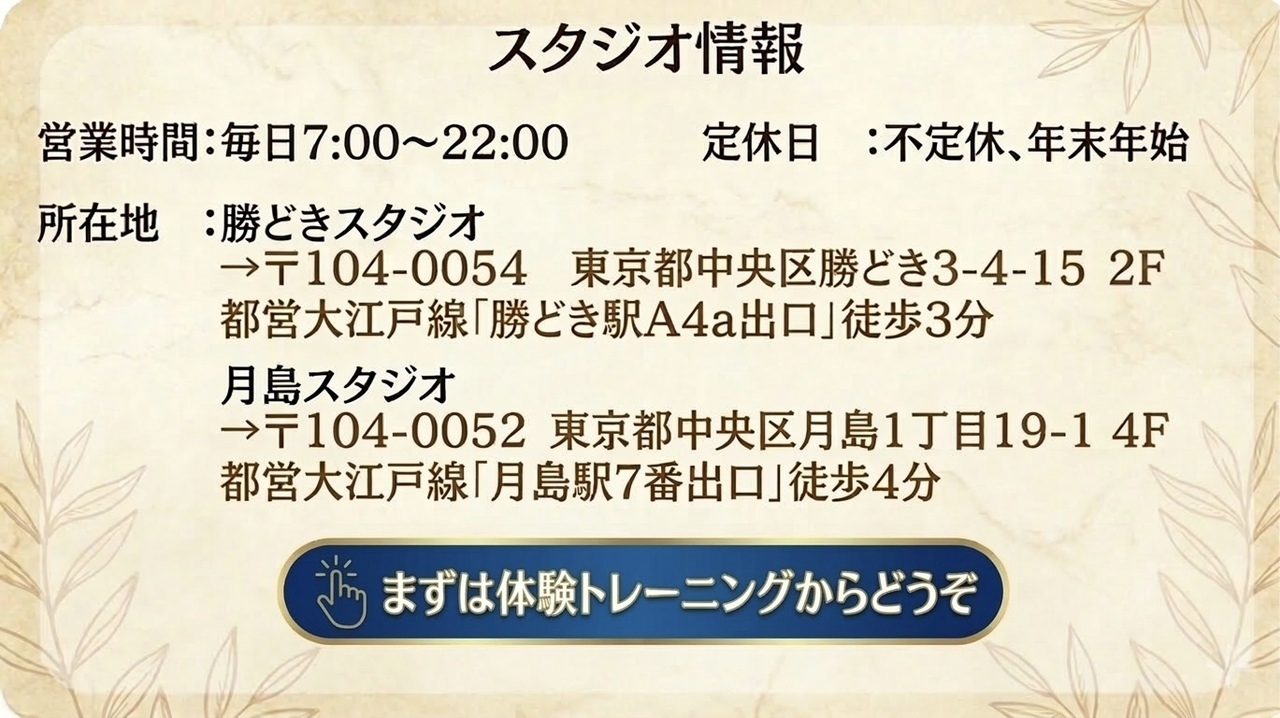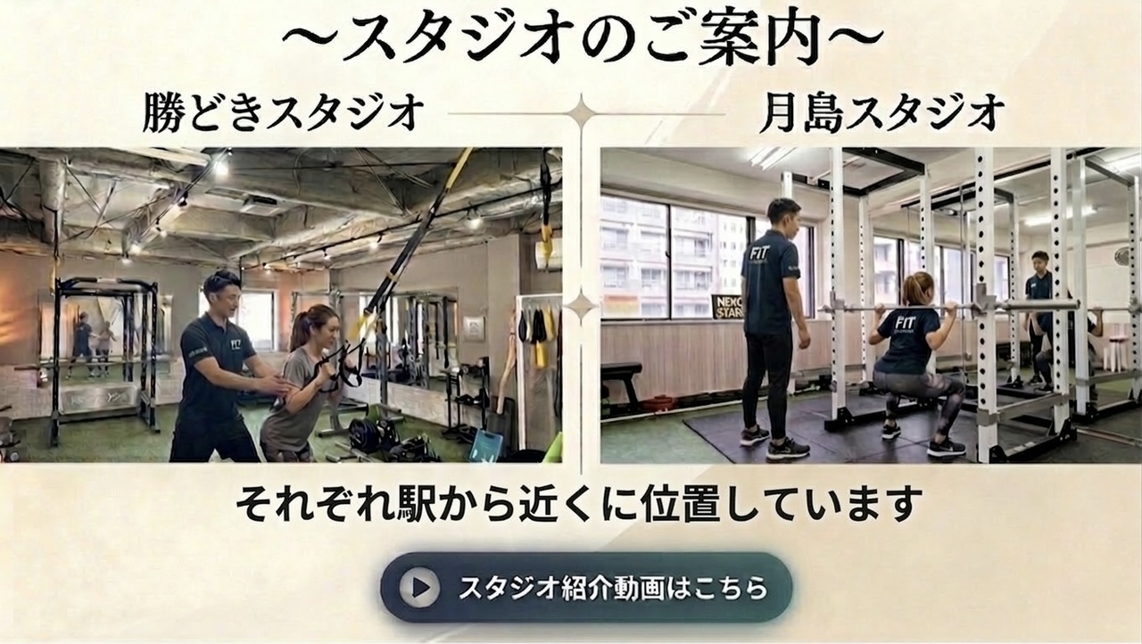 ※2023年9月に月島スタジオをリニューアルをして、より快適で明るい空間となりました。明るい雰囲気のスタジオでトレーニングを習慣にすることが出来ます。